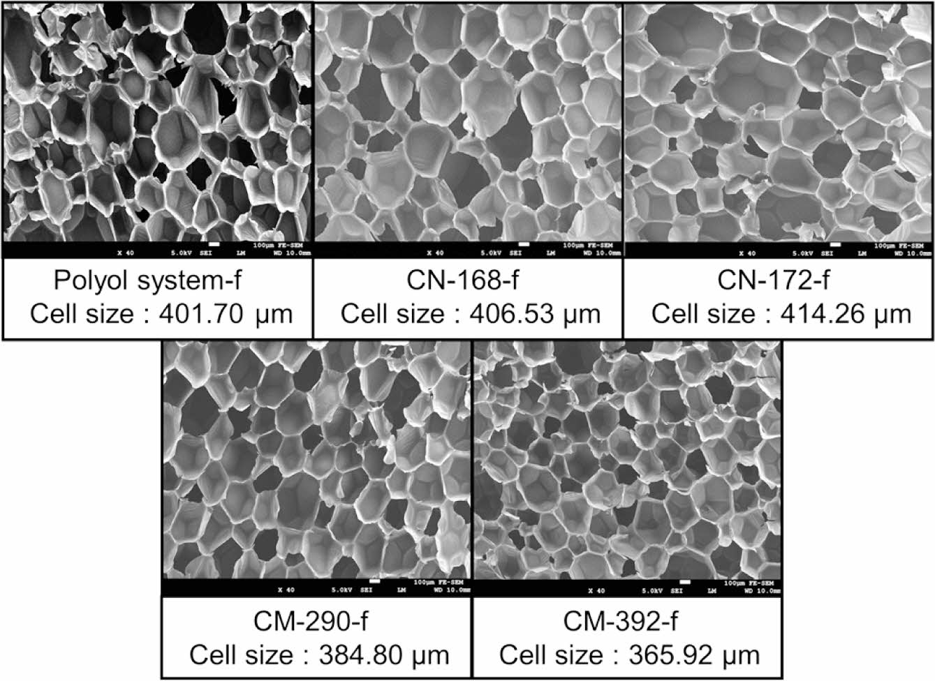 CM 폴리올이 혼합된 RPUF 간의 cell 크기를 비교하면, 작용기수가 많고 OH value가 큰 CM-392-f의 cell이 CM-290-f의 cell에 비해 더 작은 것을 볼 수 있다. 이는 작용기수가 많고 OH value가 높을수록 우레탄 반응 시 발생하는 반응열이 커지면서 반응속도가 빨라졌기 때문이다.11