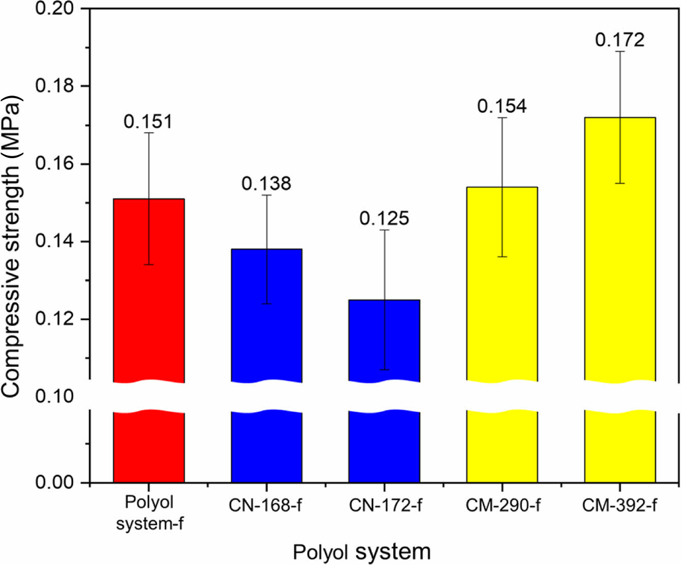 CM-f 간의 압축 강도를 비교하면, OH value가 크고 작용기수가 많은 CM-392-f가 CM-290-f에 비해 높은 압축강도를 가진다. 이는 OH value가 크고 작용기수 많을수록 가교 결합이 증가하기 때문이다.11