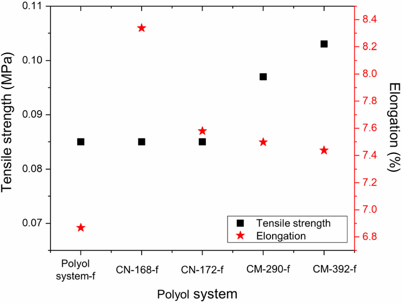Figure 7 Tensile strength and elongation of RPUF according to polyol systems. |