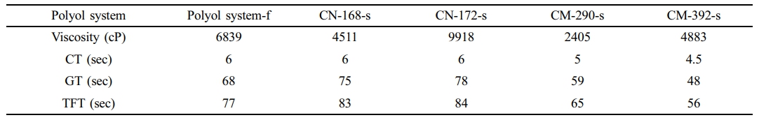 폴리올에 따른 반응속도. 석유계 폴리올 시스템과 카다놀 기반 폴리올을 80:20(wt%)로 혼합한 혼합 폴리올 시스템과 석유계 폴리올 시스템(Polyol system-s)을 각각 사용하여 RPUF를 합성하면서 폴리올에 따른 반응속도를 Table 2에 나타내었다.