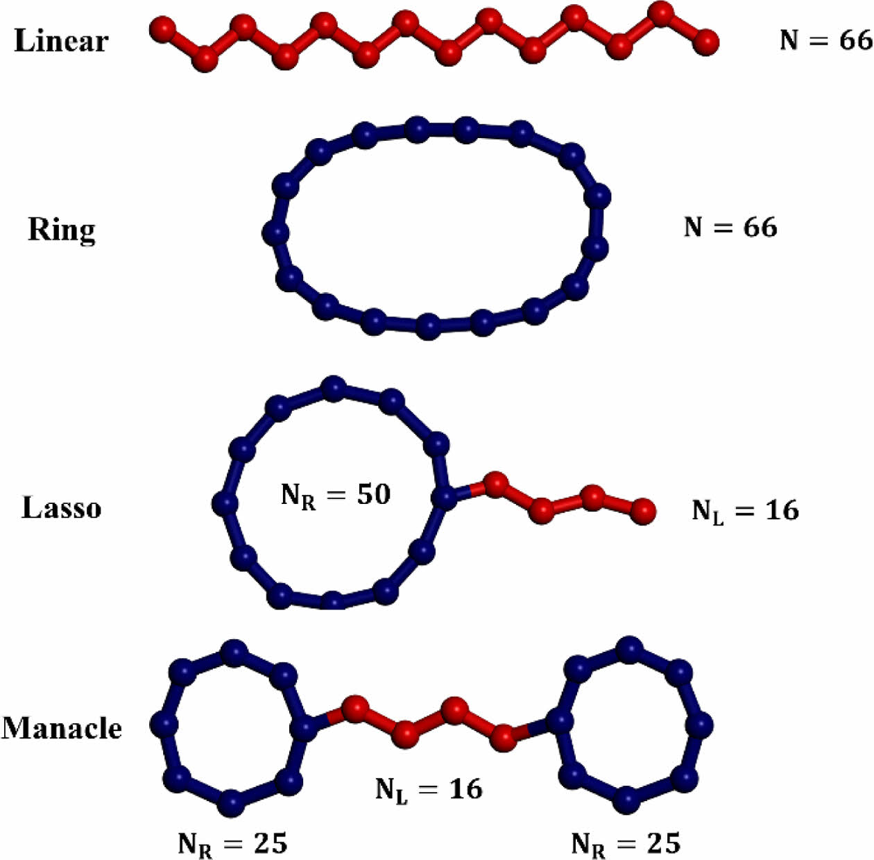 Figure 1 Schematic representation of four types of polymers. Lasso and manacle-shaped polymer are constructed by pure ring and pure linear polymer. NL and NR denoted the number of beads, which constitute pure linear and ring polymer, respectively |
