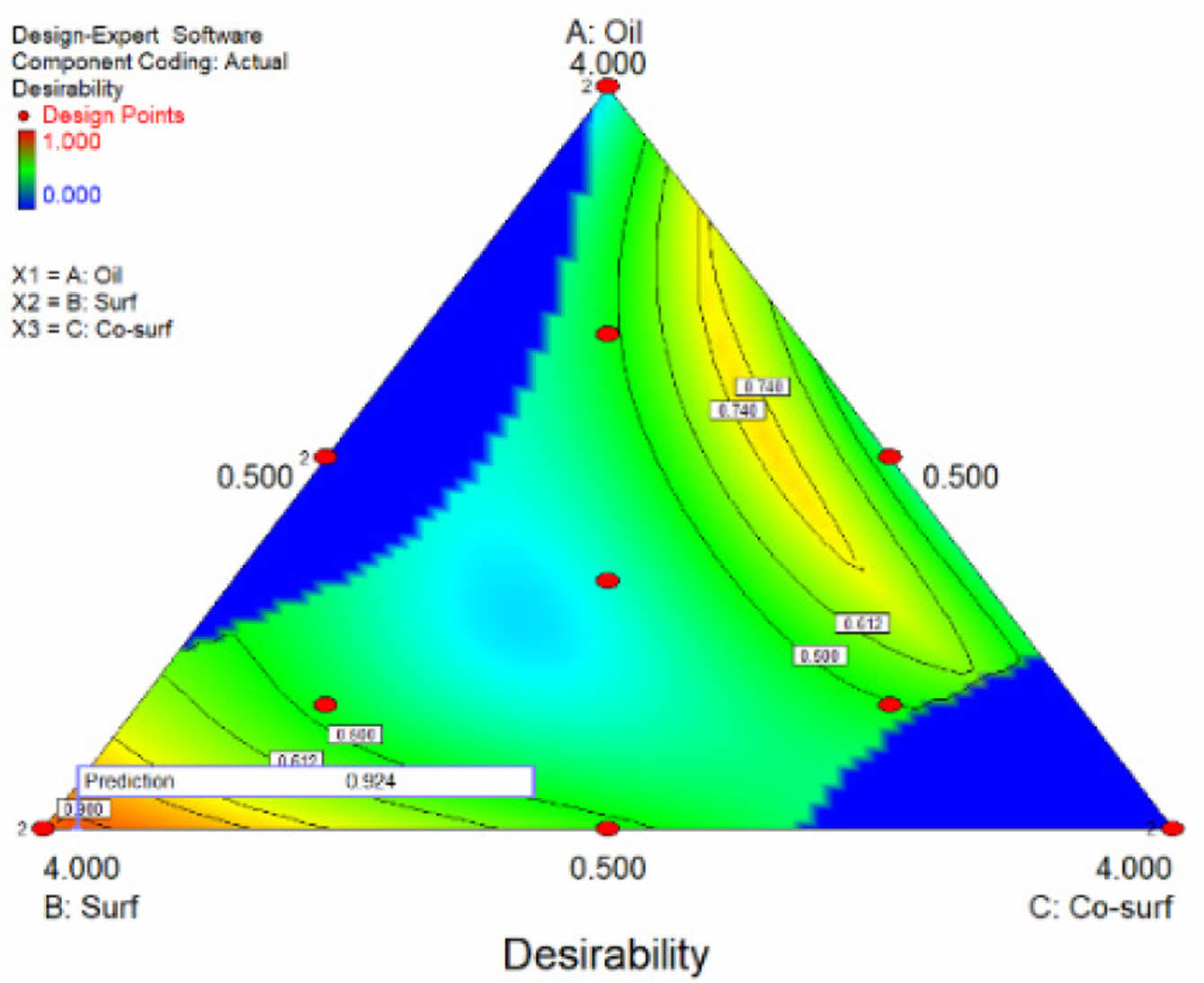Figure 2 Ternary contour plots of the desirability profiles for varying ratios of oil, surfactant, and co-surfactant. |