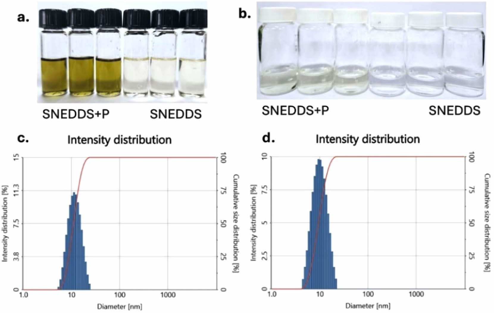 Figure 4 Visual appearance of SNEDDS formulations: (a) before dilution; (b) after 1:25 dilution in deionized water, showing well-dispersed nanoemulsions. Diagram of the size intensity distribution profiles for (c) SNEDDS; (d) parsley SNEDDS. |
