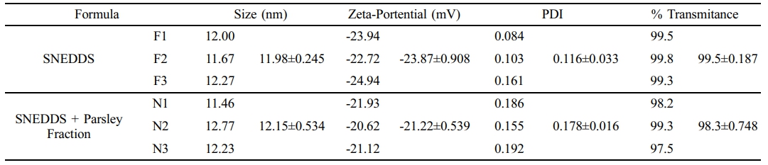 Table 2 Droplet Size, Zeta Potential, Polydispersity Index (PDI), and Percent Transmittance Data for SNEDDS and Parsley-loaded SNEDDS |