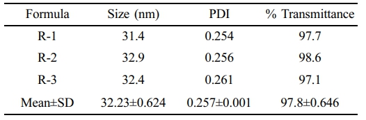Endurance Test: The formulation that passed the freeze-thaw cycle test was subjected to an endurance test. Dilutions of the formulation were prepared at 25-, 50-, and 100-fold with deionized water. Changes in % transmittance, PDI, and particle size were then measured using DLS (Otsuka, Japan) to assess formulation stability.21