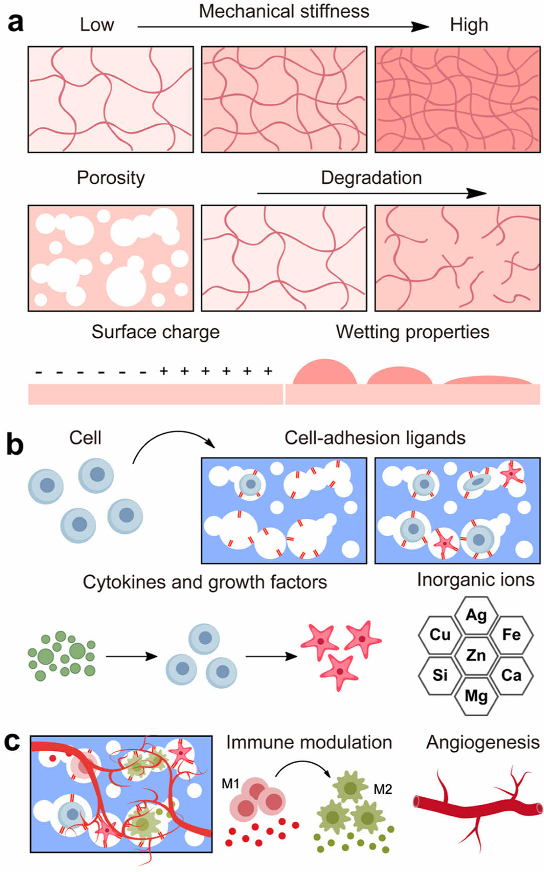 Figure 2 Design approaches for in situ tissue regeneration: (a) biophysical properties (e.g., mechanical stiffness, porosity, degradation, surface charge, and wettability); (b) biochemical properties (e.g., cell adhesion ligands, cytokines, growth factors, and inorganic ions); (c) endogenous tissue regeneration through biophysical and biochemical modulation. |