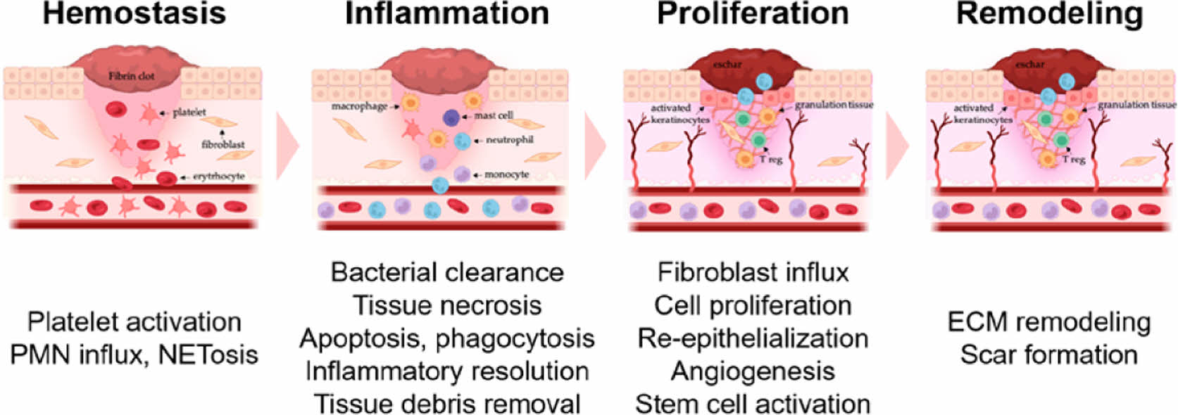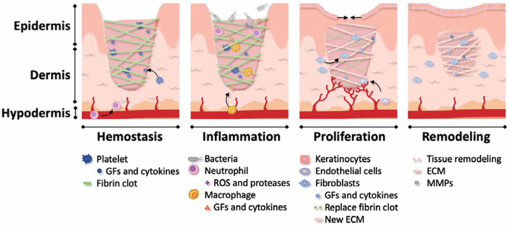 The skin is the largest organ in the body and performs various essential functions.23 It protects the body from external factors, regulates temperature, and detects sensations. However, wounds can easily occur owing to external stimuli, such as mechanical stimuli, thermal injuries, or radiation exposure. When these injuries occur, the body engages in a complex healing process that consists of four overlapping phases: 1) hemostasis, 2) inflammation, 3) proliferation, and 4) remodeling (Figure 3).24 The primary goal of wound healing is to restore tissue integrity effectively. Without proper treatment, these injuries may progress into chronic conditions, posing substantial obstacles to recovery. Therefore, identifying effective treatment strategies to promote tissue regeneration is critically important.2,24,25