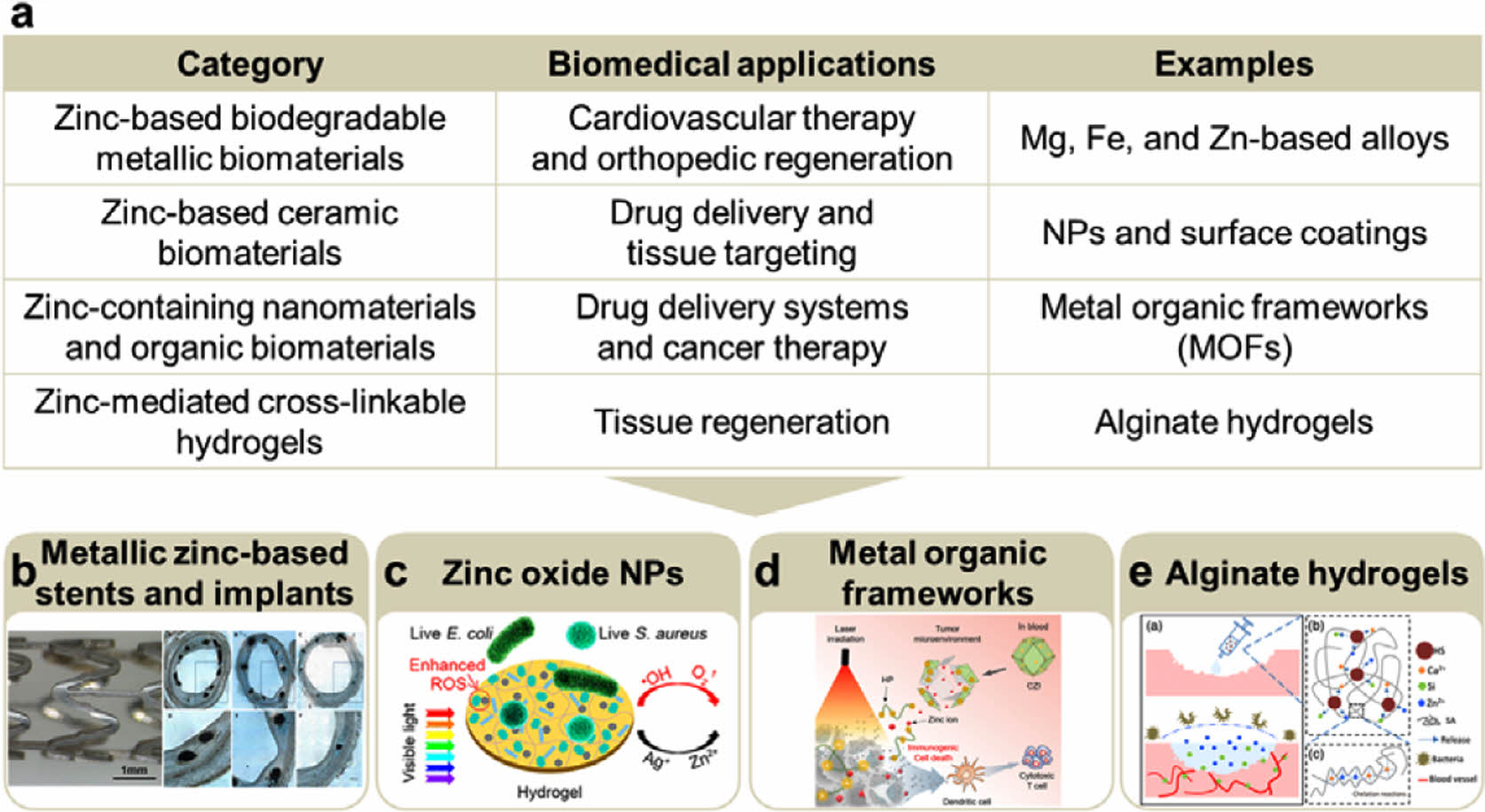 Zn2+-releasing biomaterials have been utilized in various fields including tissue regeneration and medical treatment. These materials include zinc-based degradable metallic biomaterials, zinc oxide nanoparticles (ZnO NPs), zinc-containing metal-organic frameworks (MOFs), and zinc-mediated cross-linkable hydrogels (Figure 5(a)).48