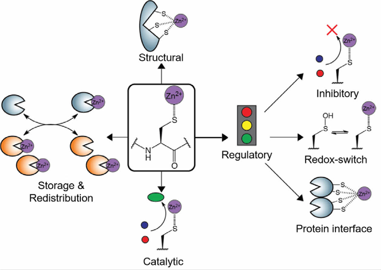 Figure 6 Overview of the major functions of Zn2+-cysteine complexes. Reproduced with permission from Ref. 67, Pace, N. J. et al., Biomolecules, 2014, 4, 419-434. ©2014, MDPI. |
