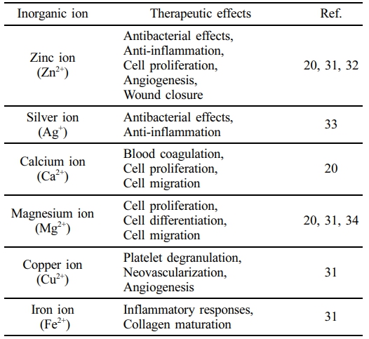 Various inorganic ions have recently garnered significant attention in wound treatment because of their critical role in the healing process (Table 1). Silver ion (Ag+) is well known for its antimicrobial properties and its ability to create an anti-inflammatory environment.27,28 Calcium ion (Ca2+) stimulates cell migration and proliferation, both of which are essential for tissue repair.29 Additionally, copper ion (Cu2+) promotes angiogenesis and improves wound healing.30 Among the reported inorganic ions, Zn2+ has been shown to regulate multiple stages of the wound healing process. It enhances hemostasis, exhibits antibacterial activity, immune modulation, cell proliferation, angiogenesis, supports hair follicle development, and stimulates collagen synthesis.31,32 Due to these therapeutic effects, Zn2+ has been widely used as a therapeutic agent for wound care and tissue regeneration.23