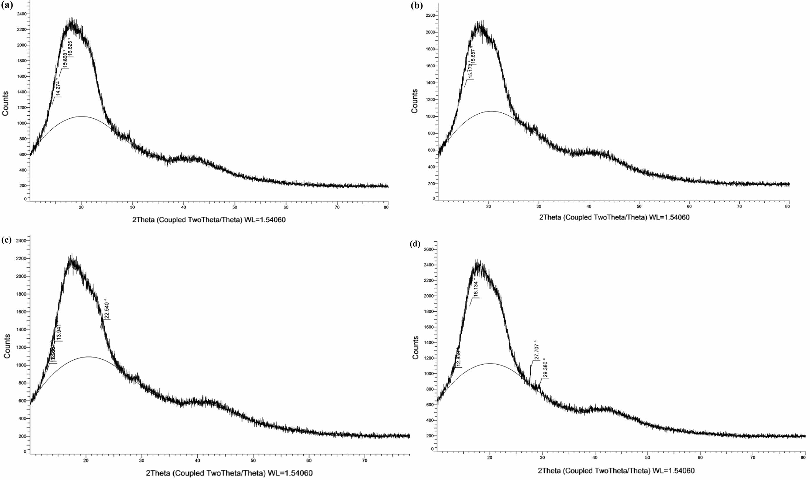 Figure 4 XRD results of fibre treatments CQF: (a) before; (b) after BF; (c) before; (d) after. |