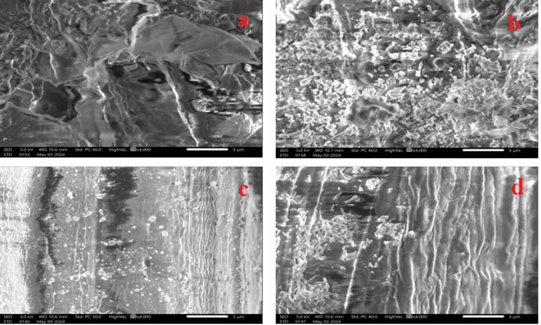 Following treatment with calcium hydroxide, SEM analysis Figure 5(a) and 5(b) for Cissus quadrangularis and Figure 5(c) and 5(d) for banana fibers demonstrate significant modifications in surface morphology and structural integrity. Figure 5(a) and 5(c) indicate that the alkaline treatment has smoothed the surface of Cissus quadrangularis fibers, reducing irregularities and potentially enhancing fiber uniformity. Some fibers may exhibit signs of degradation or breakdown, visible in the SEM images, with changes in pore sizes and more defined cross-sectional profiles. Meanwhile, Figure 5(b) and 5(d) illustrate that the banana fibers maintain their structural integrity post-treatment, with minimal surface etching and subtle improvements in pore distribution.