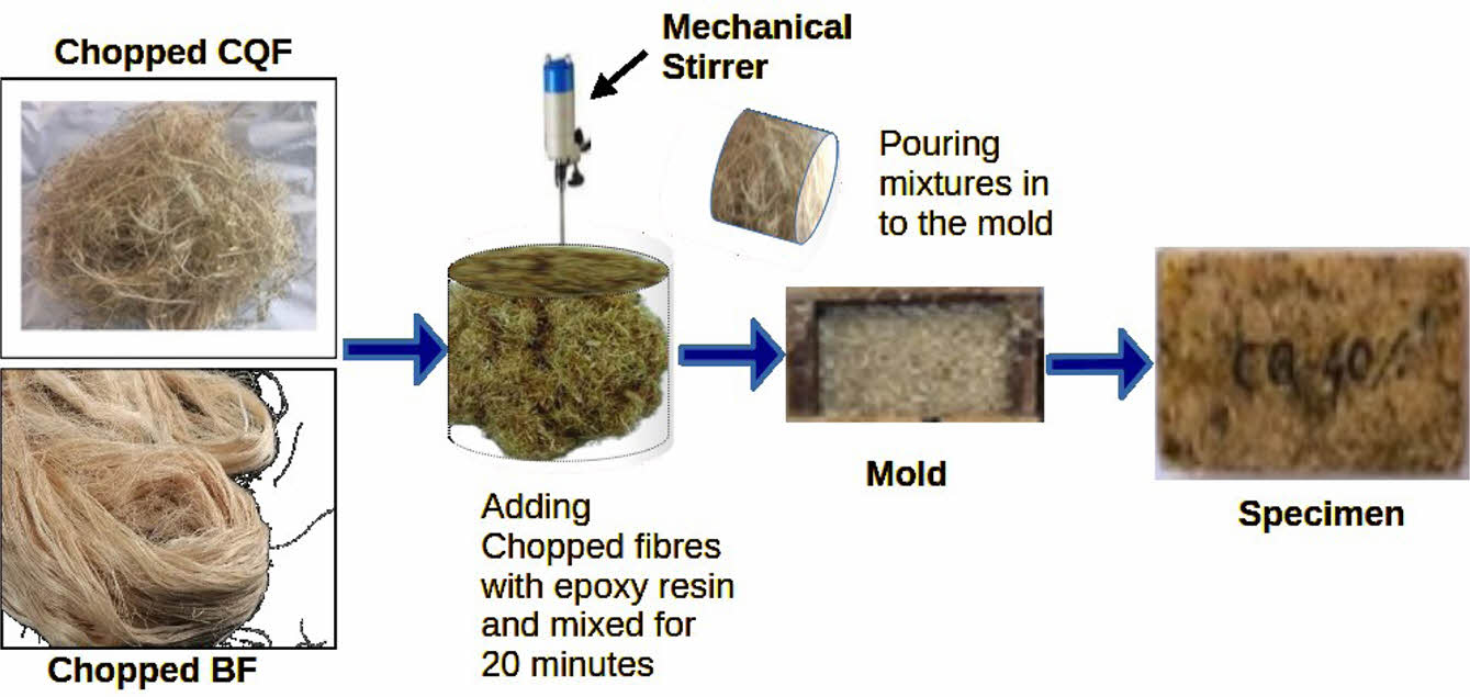 Composite Fabrication. The composite fabrication process began with the preparation of fibers, where treatedfibers were cut into 6 mm lengths. Following this, the epoxy resin and hardener were mixed in a weight ratio of 10:1, adhering to the manufacturer's instructions. During the composite mixing stage, the fibers were evenly distributed within the epoxy resin mixture, by varying a fiber ratio of in sample weight percentage were shown in Table 2. The composite fabrication process began with the preparation of fibers, where treated fibers were cut into 6 mm lengths. Following this, the epoxy resin and hardener were mixed in a weight ratio of 10:1, adhering to the manufacturers instructions. During the composite mixing stage, the fibers were evenly distributed within the epoxy resin mixture, by varying a fiber ratio of in sample weight percentage were shown in Table 2. Subsequently, the mixture is mixed by mechanical stirrer and it was poured into a mould with dimensions of 80 × 25 × 10 mm using the hand lay-up method shown in Figure 6. Figure 7 Shows the prepared composite specimens (80 × 25 × 10 mm) of CQF and Banana chopped Fibers with different weight percentage as shown in Table 2 and the samples are allowed to cure at room temperature at 33 ℃ for 3 days. Six sample compositions were prepared with varying ratios of CQF (0, 20, 40, 60, 80, and 100% respectivey). Here the samples are named as S1, S2, S3, S4, S5, and S6.