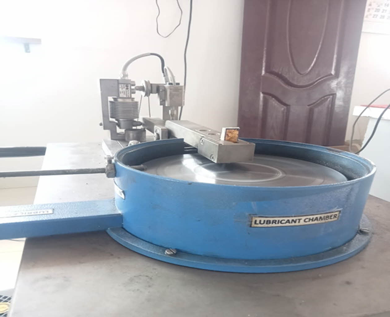 Wear Rate Analysis. Wear rate testing was conducted using a tribometer (pin-on-disk) testing machine, following ASTM G99 standards. In this procedure, a composite sample was mounted onto the machine, with a standard steel pin serving as the counter material. The test was performed under specific parameters: a load of 10 N, a sliding speed of 365 rpm,track radius of 0.04 m and a duration of 660 seconds. The goal was to evaluate the material's resistance to wear under simulated conditions, as illustrated in Figure 9. The wear rate and coefficient of friction were calculated using Eqs. (1) and (2).