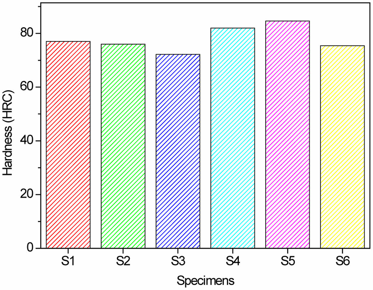 Wear Rate Analysis. The wear rates among the samples show that S2 has the lowest wear rate at 9.91505 × 10−10 Kg/Nm, indicating the highest resistance to wear. S3, S4, and S5 all share a wear rate of 1.98301 × 10−9 Kg/Nm, demonstrating good wear resistance but not as high as S2, S6, with a wear rate of 2.97451 × 10−9 Kg/Nm, has lower wear resistance compared to S3, S4, and S5. S1 exhibits the highest wear rate at 3.96602 × 10−9 Kg/Nm, indicating the least resistance to wear. The results of specimen hardness are shown in Table 3 and Figure 11.