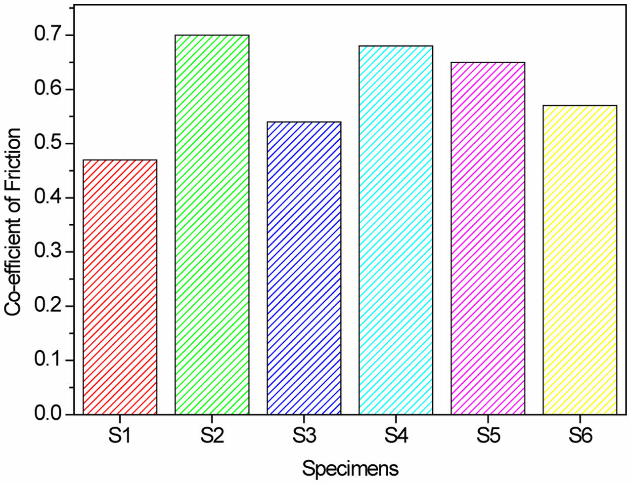 Coefficient of Friction Analysis. The coefficients of friction for the samples indicate varying levels of resistance to sliding. S2 has the highest coefficient of friction at 0.70, indicating the most resistance to sliding, followed closely by S4 at 0.68 and S5 at 0.65. S6 shows moderate frictional properties with a coefficient of friction of 0.57, while S3 also has a moderate value of 0.54. S1 has the lowest coefficient of friction at 0.47, indicating the least resistance to sliding. .The results are shown in Table 3 and Figure 12.