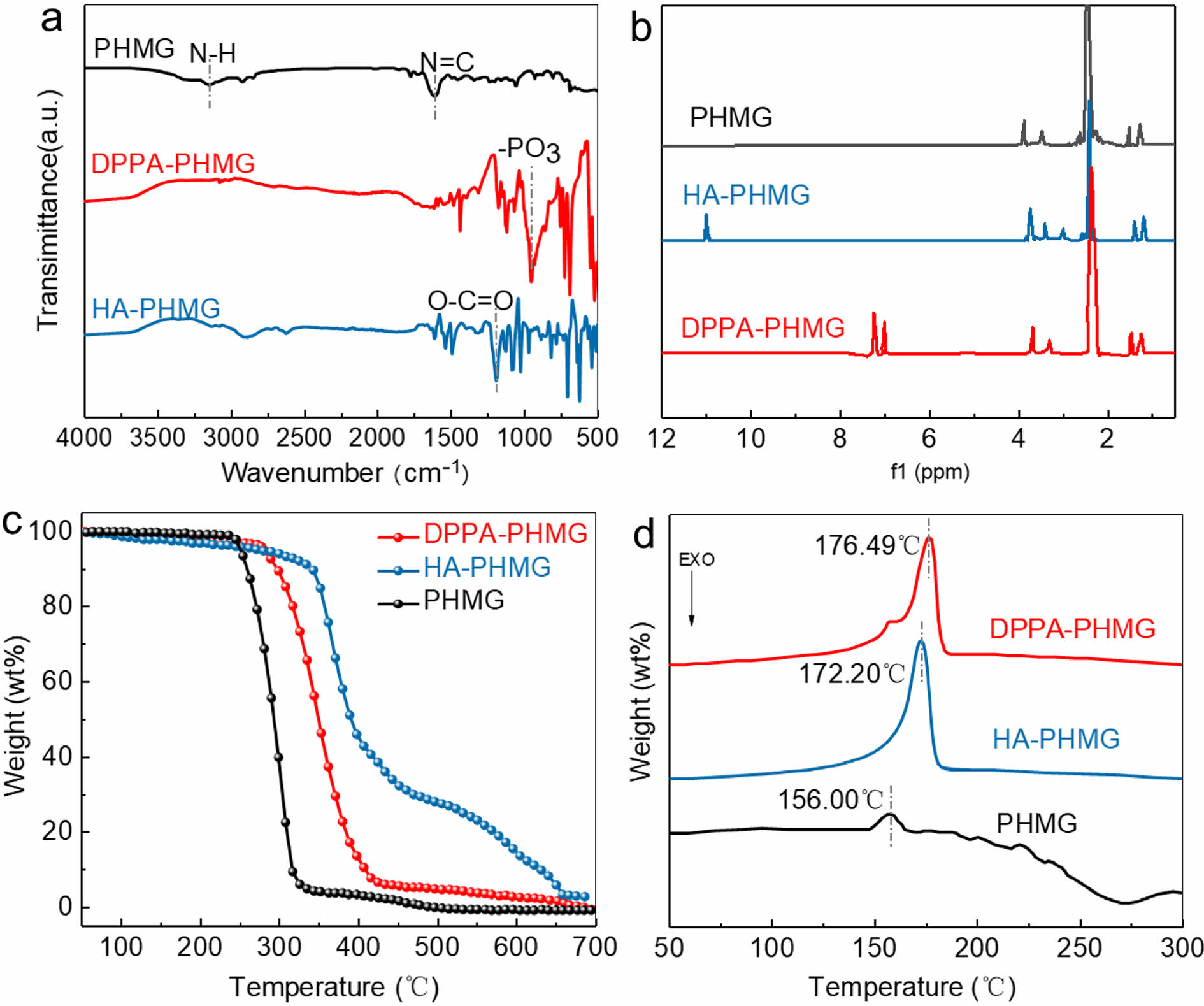 Figure 1 Characterization of smaples by: (a) FTIR; (b) 1 H NMR; (c) TG; (d) DSC spectra of PHMG, DPPA-PHMG, and HA-PHMG. |