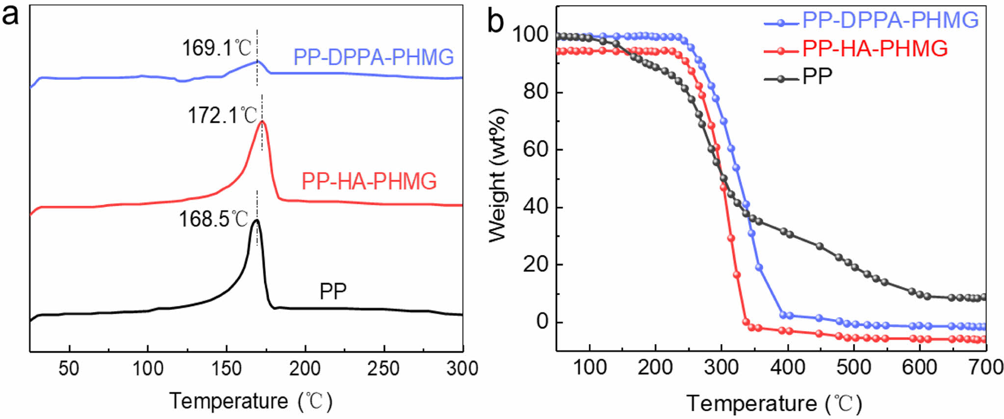 Figure 2 (a) DSC; (b) TG curves of PP, PP-HA-PHMG, and PP-DPPA-PHMG masterbatches. |