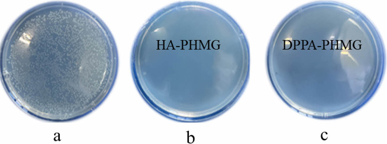 Figure 3 Digital photography of petri dishes after antimicrobial experiments of E. coli by: (a) PP; (b) HA-PHMG-PP; (c) DPPA-PHMGPP membranes. |