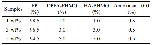 Preparation of Functional PP Masterbatch. DPPA-PHMG 1.0 g, PP masterbatch 98.5 g and 0.5 g antioxidant 1010 were mixed and then pelletized by a single-screw extruder with a screw speed of 50 r/min, heating temperature of 200 ℃ and cooling temperature of 30 ℃. The feeding and rotating speeds were 11.4 r/min. The as-produced masterbatch was dried at 40 ℃ for 4 h.