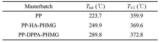 Figure 2 and Table 2 provided TG and DSC curves and data. The initial and maximum decomposition temperatures of PP-DPPA-PHMG and PP-HA-PHMG (289.8 ℃, 249.9 ℃ and 372.8 ℃, 369.6 ℃), were both higher than those of PP (223.7 and 359.9 ℃), indicating enhanced thermostability. The melting point of PP and PHMG are 168.5 and 156.00 ℃, respectively. After mixed with additives, the melting points of modified PP increased to 169.1 and 172.1 ℃ for DPPA-PHMG and HA-PHMG. The introduction of acid segments increased both molecular weight and combination strength of intermolecular interaction among polymer chains. Consequently, this structural modification endowed the molecular chains with greater combining strength during heating process, thereby enhancing thermo-stability.