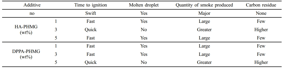 Flame Retardant Performance. Table 3provided combustion properties of samples. When the salt content was 1%, the splines ignited quickly accompanying with molten droplets. 3% HA-PHMG provided better flame retardant performance than 3% DPPA-PHMG. Molten droplets disappeared and smoke release and carbon residue increased at the same time. However, the deterioration of combustion performance of 5 wt% HA was attributed to the uneven surface under higher concentration, which in turn impacted its flame retardancy.29 The flame retardants would quickly form carbon layers in combustion process, which insulated heat transfer and O2 and hence slowed down burning speed. In conclusion, 3 wt% HA-PHMG showed superior flame retardancy, while DPPA-PHMG showed better performance when more than 5 wt%.