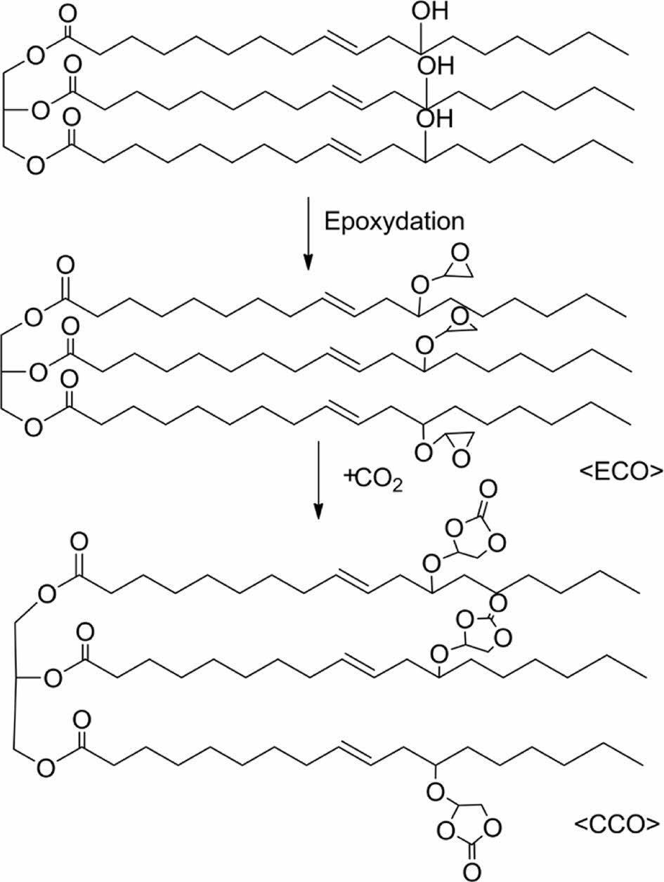 Carbonated Castor Oil(CCO) 합성. 합성한 ECO를 500 mL 3구 둥근 바닥 플라스크에 넣고 TBAB 1 g을 첨가하여 교반한다. 이후 CO2를 0.1 L/min으로 흘려주며 110 ℃에서 30시간 동안 버블링을 진행하여 환형 카보네이트를 합성하였다.