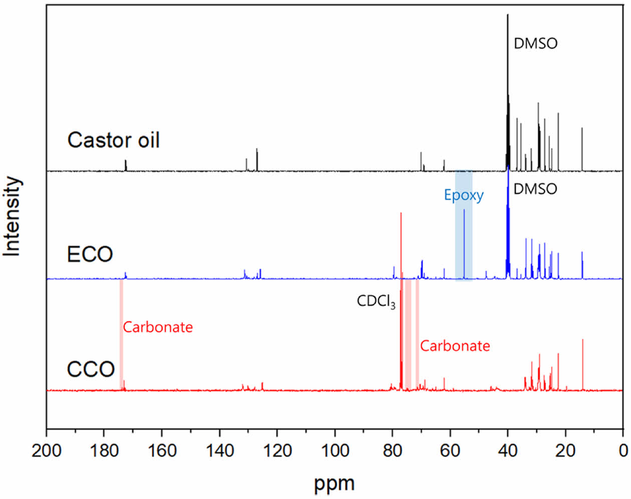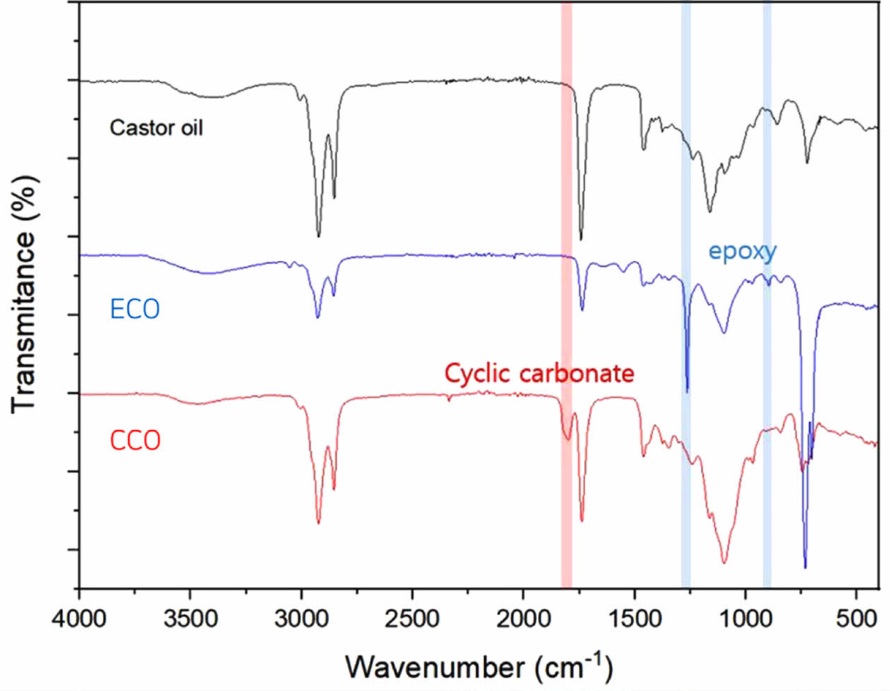 피마자유 기반 ECO, CCO의 구조 분석. 합성한 NIPU의 구조는 FTIR과 NMR을 사용하여 분석하였다. Figure 2는 피마자유와 ECO 및 CCO의 FTIR을 나타낸 그래프이다. 피마자유의 1000 cm-1, 1100 cm-1에서 C-OH 작용기의 피크가 에폭시기로 전환됨에 따라 에폭시기의 C-O-C 결합이 1250 cm-1, 908 cm-1에서 생성됨을 확인하였다. ECO에 카보네이트화가 진행함에 따라 에폭시기의 피크인 1250 cm-1, 908 cm-1가 사라지고, 1800 cm-1에서 환형 카보네이트의 C=O 피크가 나타나 CCO가 합성됨을 확인하였다. Figure 3은 피마자유와 ECO 및 CCO의 13C NMR을 분석한 결과이다. 피마자유의 13C NMR 데이터에서 주사슬의 에스테르 결합은 172 ppm, 이중결합은 약 131 ppm에서 나타나고 C-O 결합인 68 ppm의 피크를 확인할 수 있다. ECO의 그래프에서 약 55 ppm에서 에폭시기의 피크가 나타나 ECO가 합성되었음을 확인하였으며, CCO의 175 ppm에서 카보네이트의 C=O 결합이 나타나 고 75 ppm, 72 ppm에서 환형 카보네이트의 탄소 피크가 나타나 CCO가 성공적으로 합성되었음을 확인하였다. 이때, 피마자유의 에스테르 작용기를 나타내는 172 ppm과 주사슬에 있는 이중결합 피크인 131 ppm은 동일하게 존재하여 피마자유의 이중결합은 반응에 참여하지 않으면서 -OH 작용기에 합성된 에폭시 작용기가 카보네이트기로 전환됨을 확인할 수 있었다.