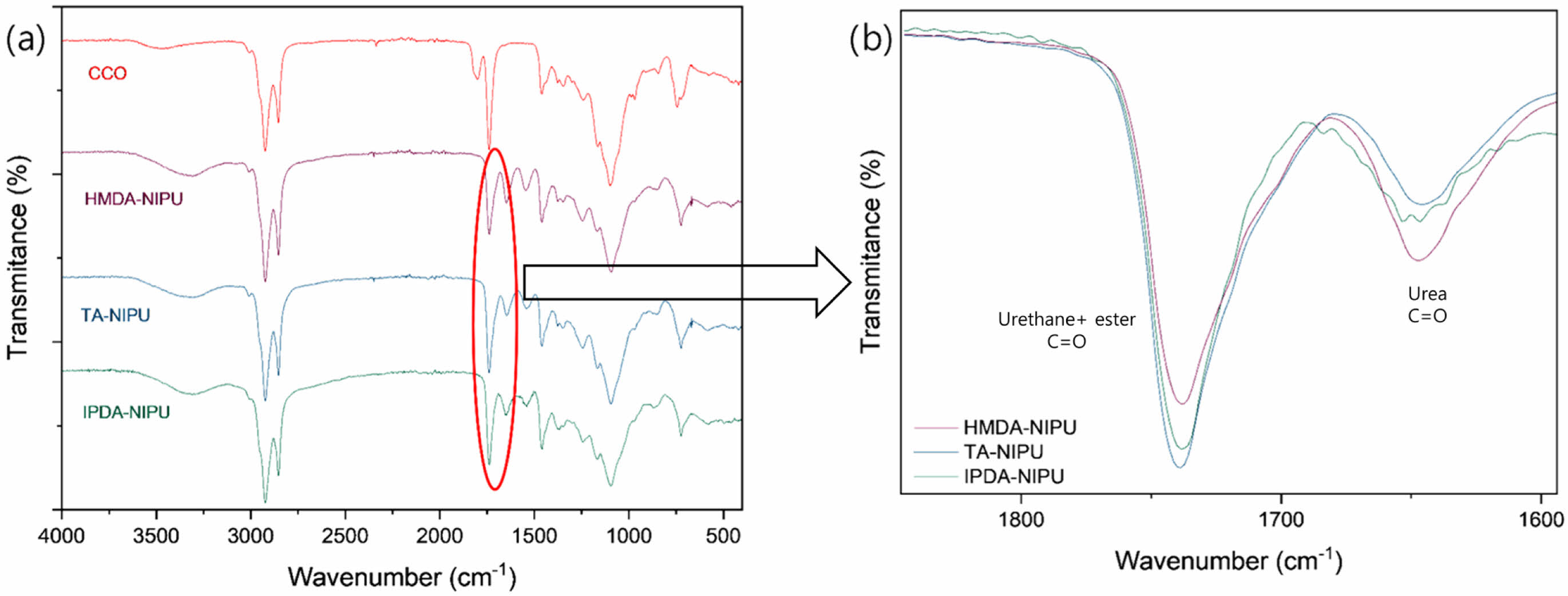 Figure 4 FTIR spectra of (a) CCO, HMDA-NIPU, TA-NIPU, IPDA-NIPU; (b) 1600-1800 cm-1 peak of NIPUs. |