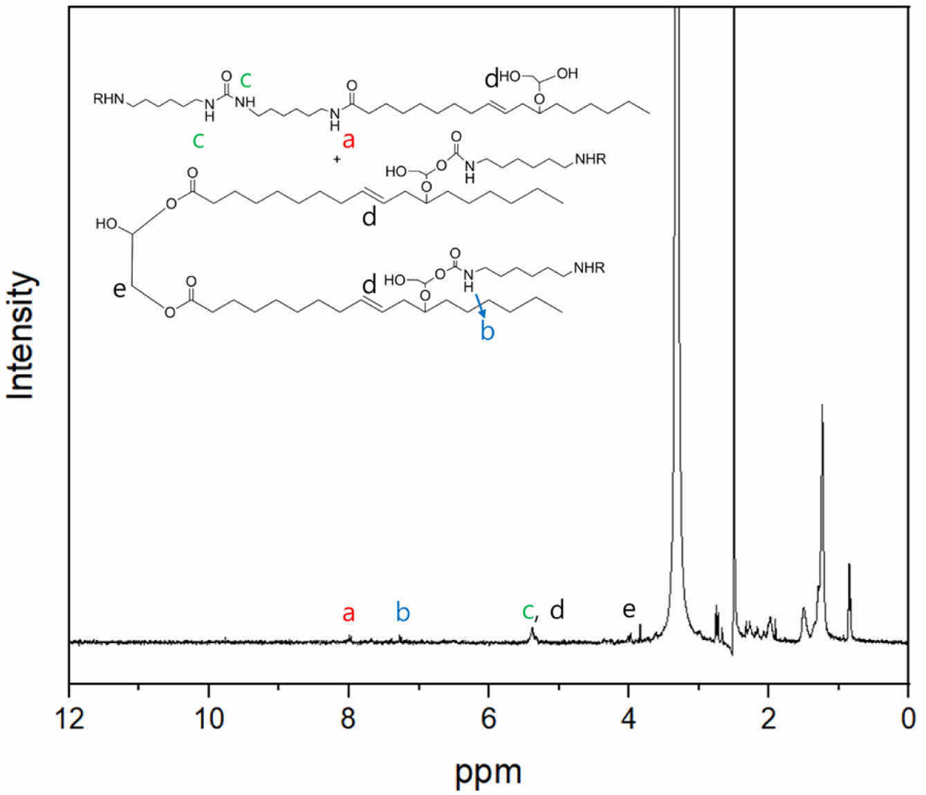 HMDA-NIPU는 IPDA-NIPU와 TA-NIPU에 비해 우레탄 피크인 1730 cm-1는 줄어드는 반면 우레아를 나타내는 1660 cm-1 피크는 증가하는 경향을 나타내었다. 이는 아민 화합물이 카보네이트와 반응하여 NIPU를 합성한 후에 3관능기를 갖는 TA와 고리형 구조를 갖는 IPDA에 비해 유동성이 자유로운 과량의 HMDA가 NIPU의 우레탄이나 에스테르 작용기와 추가 반응하여 우레아나 아미드를 형성하였기 때문으로 사료된다(Figure 5). Figure 6에 나타낸 HMDA-NIPU의 1H NMR 그래프에서는 7.2 ppm에서 우레탄 결합의 피크가 나타나는 것을 확인할 수 있다. 추가적으로, 8.0 ppm에서 아미드 결합의 피크, 5.3 ppm에서 우레아 및 주사슬의 C=C 결합의 피크가 나타나 추가반응이 일어난 것을 확인할 수 있었다.