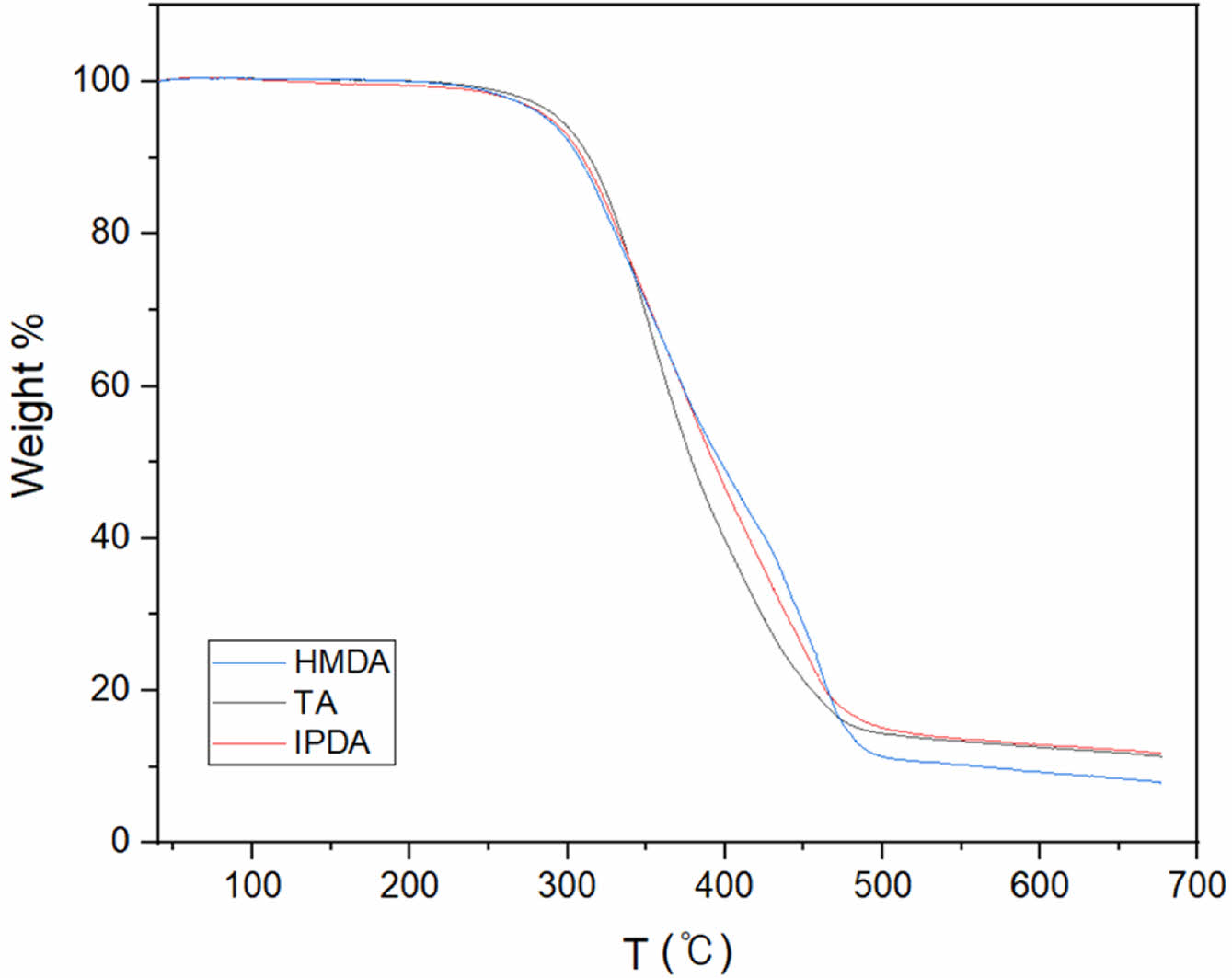 Figure 7 TGA curves of HMDA-NIPU, TA-NIPU, and IPDA-NIPU. |