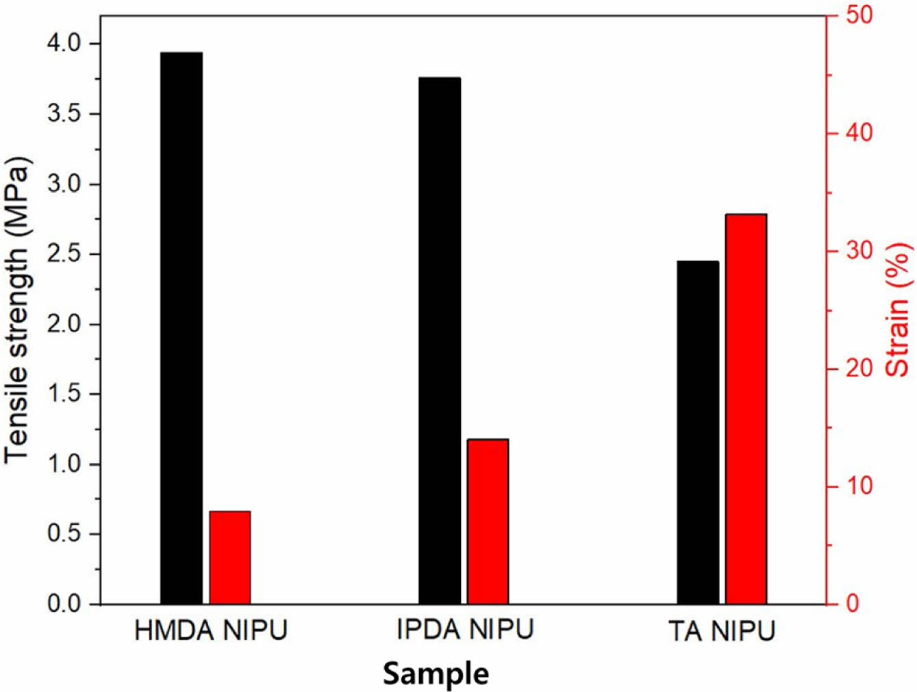 Figure 8 Mechanical properties of HMDA-NIPU, IPDA-NIPU, and TA-NIPU films. |
