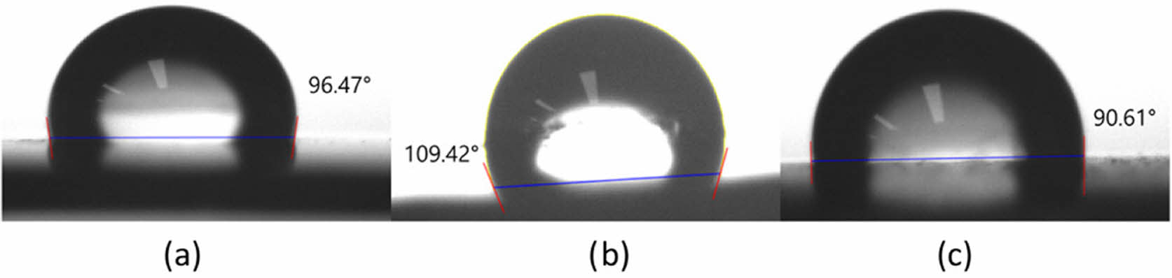 Figure 9 Contact angle of NIPU films: (a) HMDA-NIPU; (b) IPDA-NIPU; (c) TA-NIPU. |
