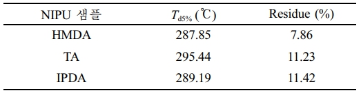 피마자유 기반 NIPU 필름의 열적 특성 분석. 아민 종류에 따른 NIPU 필름의 열적 특성을 TGA를 사용하여 비교하였다. 초기 분해는 Figure 7 및 Table 1에서 보는 바와 같이 288 ℃부터 NIPU 필름의 분해가 시작되어 세 종류의 필름에서 유사한 경향성을 나타낸다. 분해가 끝난 뒤 잔여 질량을 확인하면 HMDA의 경우 가장 낮은 7.86%를 나타내는 것을 알 수 있다. 이는 추가 반응으로 인해 형성된 짧은 사슬로 인해 열적 안정성이 감소하는 것으로 사료된다. IPDA-NIPU는 고리형 구조로 인해 HMDA-NIPU보다 더 높은 열 안정성을 보였다.