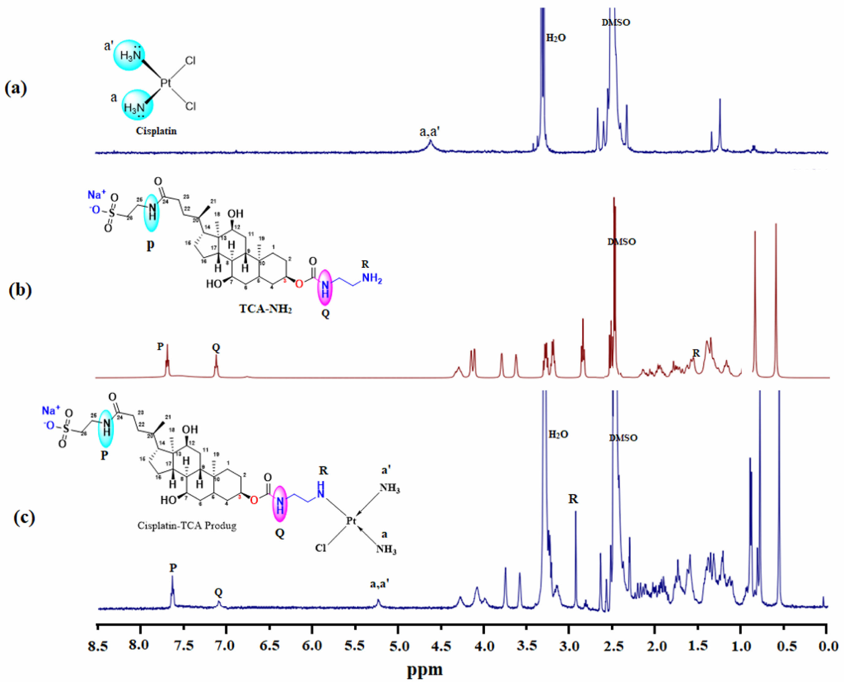 Figure 1 1H NMR (400 MHz, DMSO-d6) analysis of (a) cisplatin; (b) TCA-NH2; (c) cisplatin-TCA prodrug. |