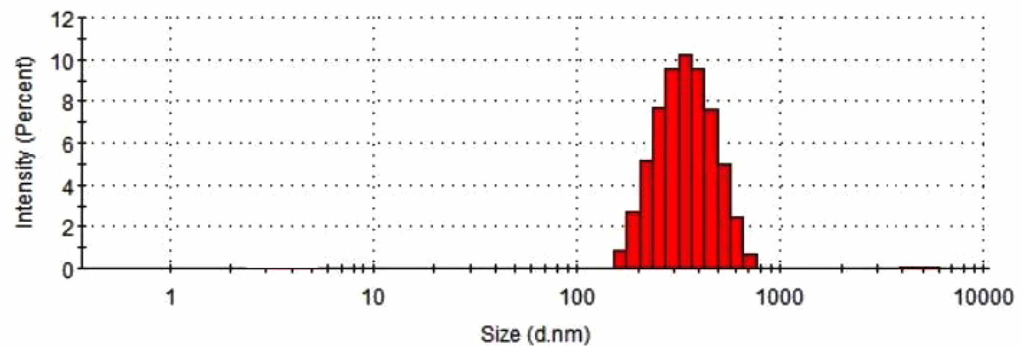 Figure 2 Particle size distribution measured by dynamic light scattering for TCA-cisplatin pro-drug. |