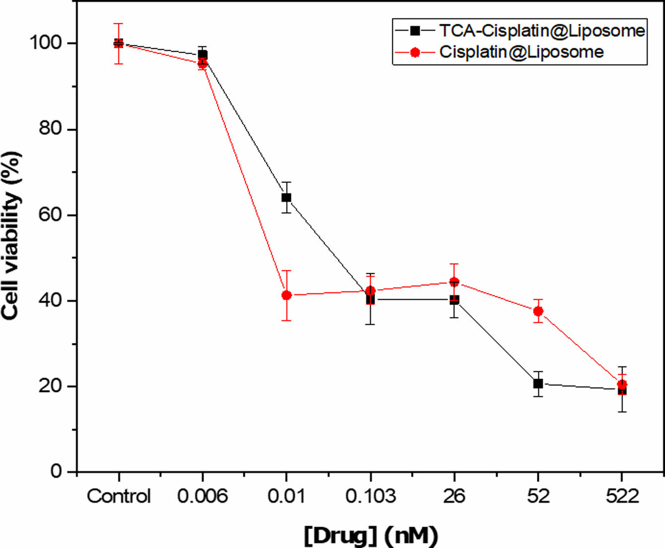 In Vitro Cytotoxicity of TCA-cisplatin@liposomes. In vitro cell cytotoxicity revealed that TCA-cisplatin loaded liposomes has toxicity on A549 cells nearly like cisplatin loaded liposomes during 48 hours. Below the concentration of 26 nM TCA-cisplatin represented 20% cell viability whereas cisplatin loaded liposome showed over 30%. The conjugate pro-drug liposome reveals almost similar in vitro cytotoxicity compared to cisplatin loaded liposomes. The IC50 was 0.05 and 0.004 of TCA-cisplatin liposome and cisplatin-liposome respectively (Figure 4).
