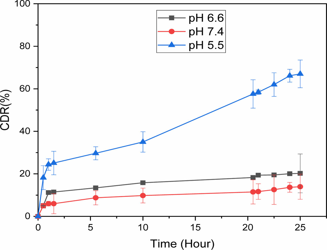 In Vitro Drug Release Study of TCA-cisplatin@liposomes. Controlled release represents considerable advantages in the drug delivery system compared to regular dosage forms.26 In this current study 67% of cisplatin was released from liposome in a controlled fashion during 24 hours at pH 5.5 which resembles the cancer cell environment. On the other hand, at pH 7.4 and pH 6.6 the drug release was minimal, 13.9% and 20% respectively. There was no burst release at any pH for TCA-cisplatin loaded liposomes (Figure 5).