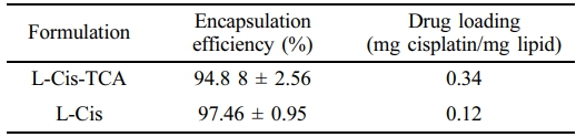 The entrapment efficiencies and vesicular size were methodically listed for different liposomes presented in Table 1 and 2. The entrapment efficiency of L-CisTCA was 94% near to L-Cis that was 97% (Table 1); although 0.34 mg and 0.12 mg of cisplatin was loaded per mg of lipid in L-CisTCA and L-Cis respectively.