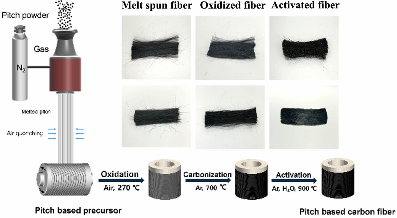 Characterizations. The elemental components of the two pitch powders were detected by elemental component analysis (CS744 ON836, Leco, USA). The softening points of the two pitch powders were measured according to the ASTM D3104 standard, and the reaction yield was characterized by determining the glass transition temperature using thermogravimetric analysis (TGA) with a STA 449 F3 (Jupiter, Germany). The chemical differences between melt-spun and oxidized fibers were analyzed using Fourier transform infrared spectroscopy (FTIR, L18601116, PerkinElmer, USA). Fiber morphology and micropore structures on the fiber surface were examined through field-emission scanning electron microscopy (FE-SEM, JWM-7610F, JEOL Ltd., Japan) at an acceleration voltage of 10 kV. To evaluate the melt-spinnability of pitch melts based on their viscoelastic properties, a rheometer (MCR-502, Anton Paar, Austria) with a 25 mm plate-plate geometry was used above the softening point in a nitrogen atmosphere to prevent oxidation of the pitch powders. The specific surface area was determined using a Brunauer–Emmett–Teller (BET) surface area analyzer (Tristar 3000, Micromeritics Co., USA) based on physical adsorption-desorption isotherms at 77 K.