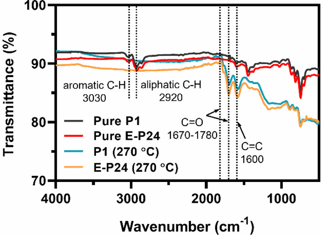 Chemical Structure. The chemical structure transformation of two types of pitch precursors in the oxidation is revealed via FTIR spectra in Figure 2. The two pitch precursors indicate common specific absorption peaks at 2920 cm-1 (aliphatic C-H stretching) and 3030 cm-1 (aromatic C-H stretching). On the other hand, the oxidized precursors generate novel specific peaks at 1670, 1680 cm-1 (C=O bonding), and 1600 cm-1 (aromatic C=C stretching with extinction of the aliphatic and aromatic C-H stretching peaks, attributing to the aforementioned introduction of oxygen atoms into carbon atoms of the pitch molecules and transformation into aromatic ring structures with dehydrogenation at 270 ℃. Besides, in both precursor and oxidized fiber, the peak intensity of E-P24 is higher than P1, which indirectly proves more oxidation reaction of the E-P24.16-18