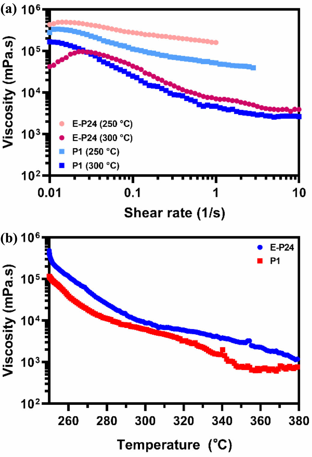 Rheological Property. The melt spinnability of each pitch-based fiber can be assessed through the viscoelastic characteristics of pitch melts using rheological analysis, as shown in Figure 5, 6. Figure 5(a) and 5(b) illustrate variations in the flow behavior of pitch melts as a function of shear rate and temperature. Each pitch melt exhibits shear-thinning behavior, where viscosity decreases with an increasing shear rate. Notably, as the temperature rises above the softening point, the reduction in viscosity becomes more pronounced. This shear-thinning behavior indicates the presence of physical entanglements between pitch chains. The E-P24 melts exhibit greater intermolecular entanglement compared to P1 melts, requiring higher shear stress to loosen chain entanglements.21,22