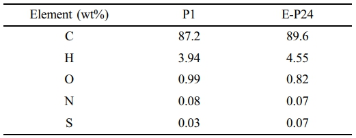 Materials. Two types of isotropic pitch powders, E-P24 and P1, were purchased from Dongyang Environment Co. (Korea) for this study. These powders have different softening points, 220 ℃ for P1 and 240 ℃ for E-P24, while exhibiting an identical mean particle size of 185 μm and similar reaction yields of 57% for P1 and 56% for E-P24. Additionally, the two isotropic pitch powders were subjected to elemental component analysis in Table 1. Both samples contained identical elements (C, H, O, N, S) and had slight differences in contents between hydrogen and carbon. All materials were used as received without further purification.