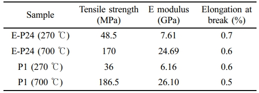 Figure 7 Tensile properties of P1 and E-P24 fibers after oxidation at 270 ℃ and pre-carbonization at 700 ℃. |
