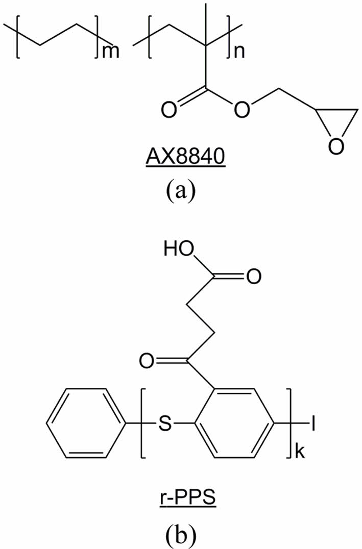 원료. Phenyl terminated-polyphenylene sulfide(이하 PPS)는 B200(SK케미칼, 대한민국)을 사용하였고 에폭시기로 개질된 폴리올레핀 엘라스토머(modified polyolefin elastomer, 이하 m-POE)로는 poly(ethylene-co-glycidyl methacrylate)형태인 Lotader AX8840(glycidyl methacrylate 8 wt%, Tm=103 ℃, Mw=105000 g/mol)(Arkema, 프랑스)을 사용하였다. 그리고 반응형 개질제로는 reactive PPS(이하 r-PPS)를 합성하여 사용하였다. AX8840과 r-PPS의 화학구조를 Figure 1에 도시하였다.