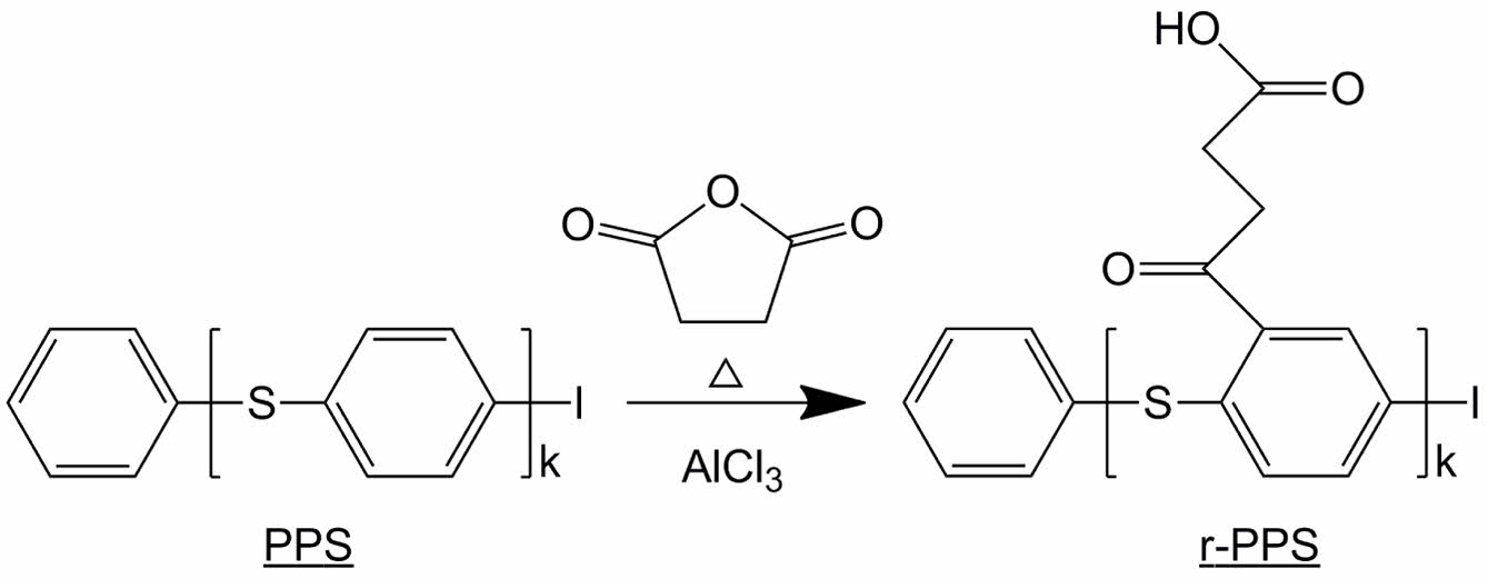 r-PPS의 합성. r-PPS를 제조함에 있어서 합성의 완벽성 보다는 시간과 비용이 적게 드는 경제적인 메커니즘을 이용하여 합성하고자 하였다. 따라서 PPS를 용해시켜 반응을 시키지 않고 펠렛 상태 그대로 표면의 일부만 반응시키는 방법을 선택하였다. 사용한 PPS 펠렛은 구형으로 직경이 2-3 mm이었다. 반응의 효과를 고려한다면 이를 분쇄하여 표면적을 증가시킬 수 있으나 이 또한 공정이 추가되어 비용이 발생하므로 펠렛 그대로 사용하였다. 본 연구에서는 Friedel-Craft 반응으로 예상되는 반응 메커니즘을 사용하였으며 Figure 2에 도시하였다.19,20