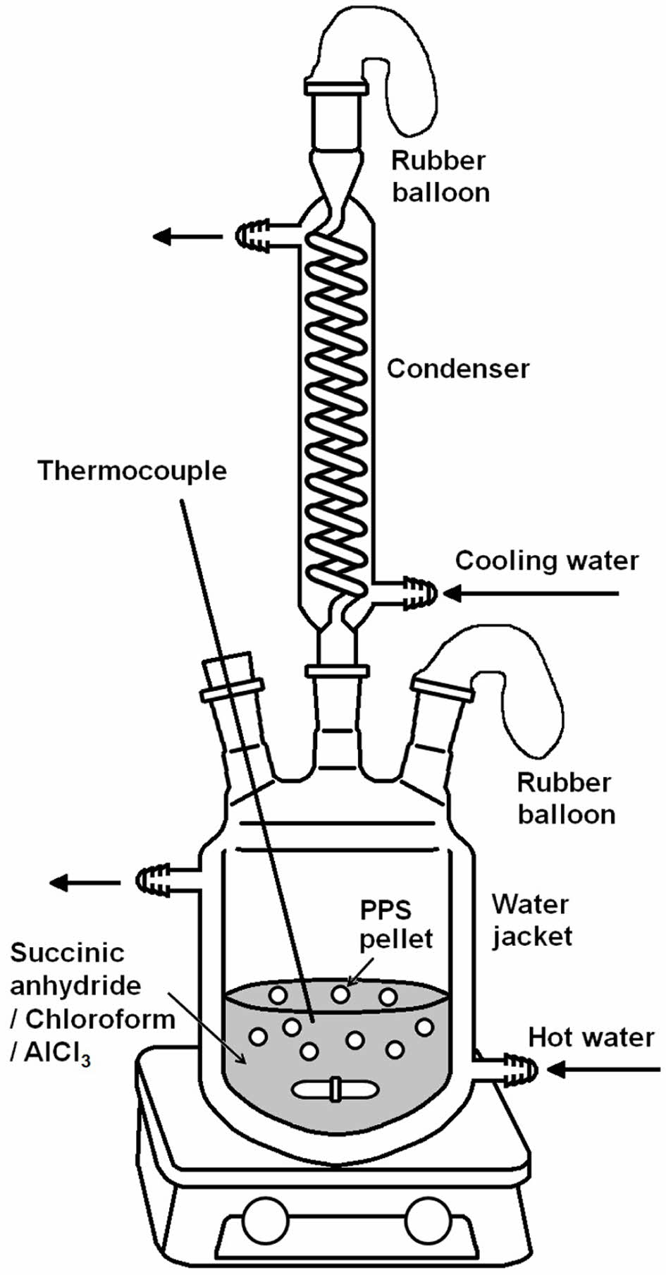 합성장치는 Figure 3와 같이 중탕 jacket이 설치된 three-neck flask에 reflux column을 연결하여 구성하였다. 반응매질로 chloroform을 사용하였고 여기에 PPS pellet, succinic anhydride, AlCl3 등을