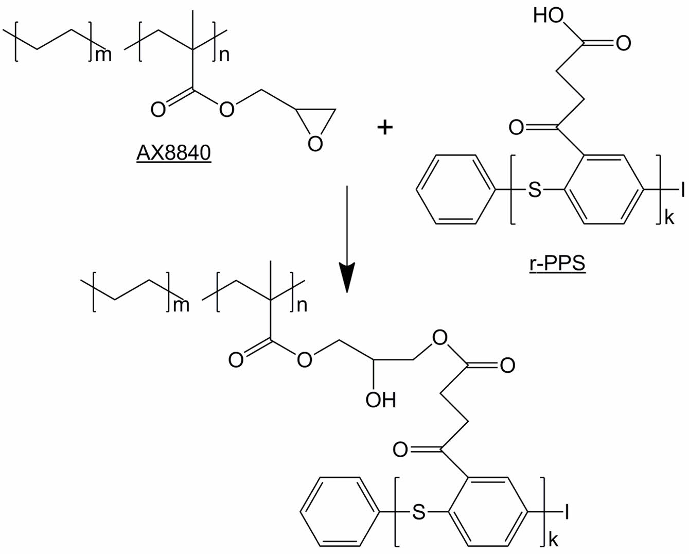 이렇게 블렌드를 제조하면 그 과정에서 r-PPS의 카복실기와 m-POE의 에폭시기가 반응하여 PPS 상과 m-POE상을 연결하여 주는 상용화제로 작용하여 물성의 향상을 기대할 수 있었다. 예상되는 반응 메커니즘을 Figure 4에 나타내었다.