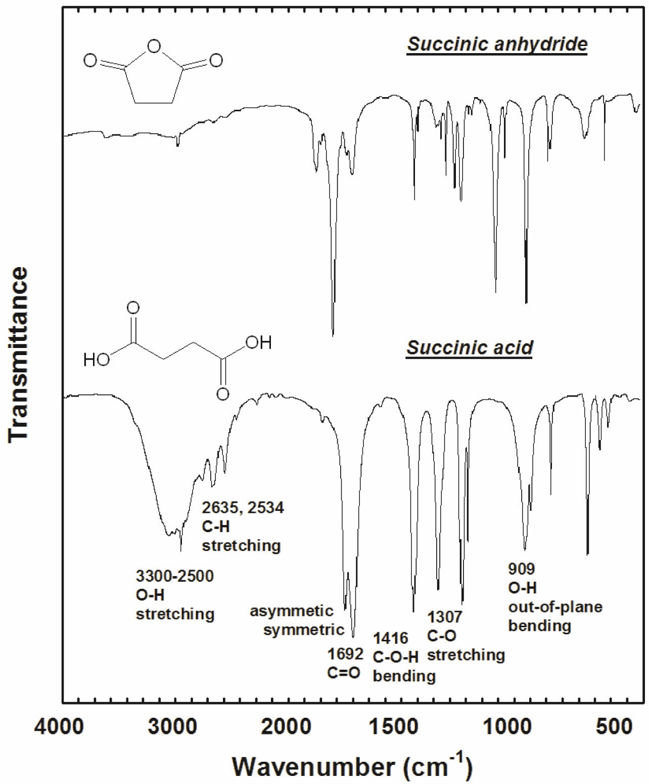 Figure 5 FTIR spectra of succinic anhydride and succinic acid. |
