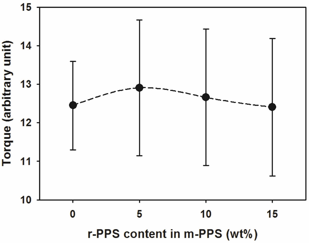 압출 과정에서의 토크의 변화를 m-PPS 내의 r-PPS 함량 변화에 따라 Figure 8에 도시하였다. r-PPS 첨가량이 증가함에 따라 토크 평균값이 증가하다가 5 wt% 이후에는 다시 감소하였으며 토크의 진폭도 더 증가한 것을 볼 수 있었다. 일반적으로 고분자 블렌드를 압출할 때 상용성이 좋을수록 토크값이 증가하는 경향이 있으므로 이 경우도 r-PPS가 PPS와 m-POE사이의 계면 접착력을 증가시켰다고 예상할 수 있으며 r-PPS 5 wt% 부근이 최대 효과를 보인다고 판단되었다.23